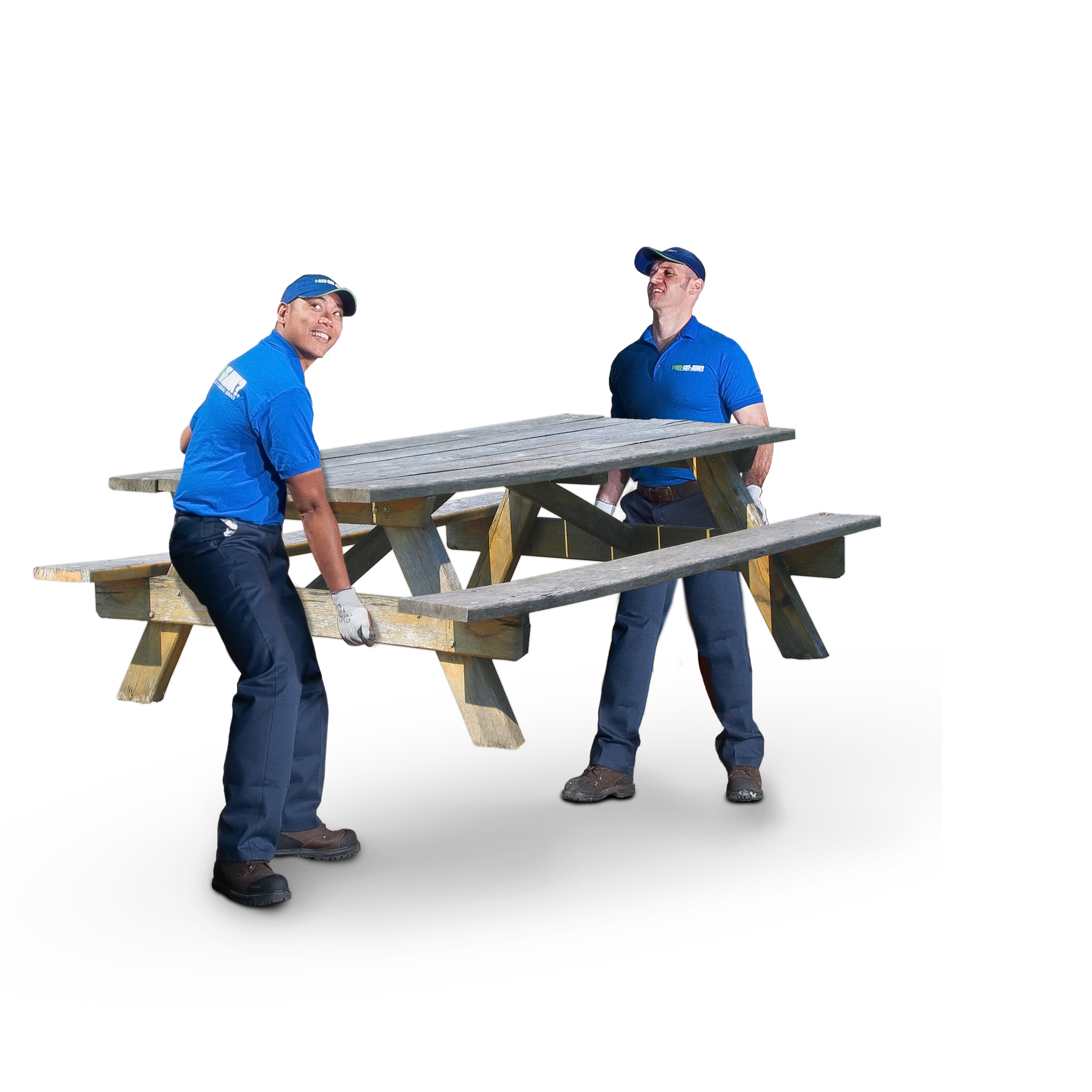 Two 1-800-GOT-JUNK? team members carrying a red sofa
